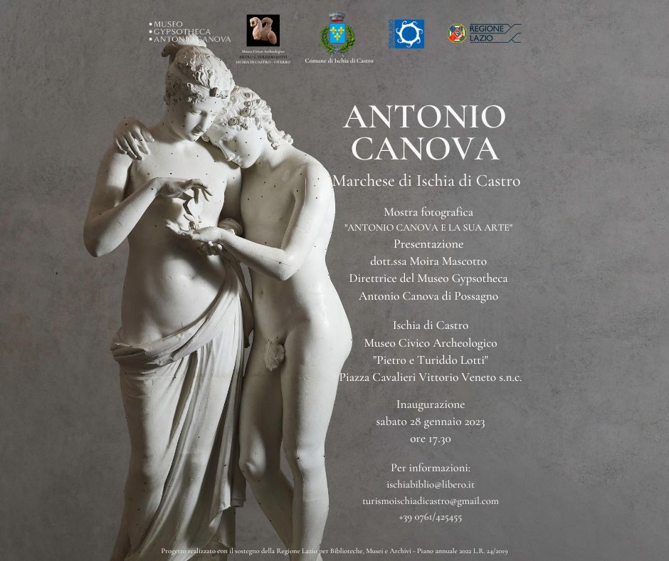 Il Museo Civico Archeologico “Pietro e Turiddo Lotti” di Ischia di Castro ospita la mostra fotografica “Antonio Canova. Marchese di Ischia di Castro” organizzata in collaborazione con il Museo Gypsotheca Antonio Canova, il Simulabo – Sistema Museale del Lago di Bolsena, il Comune di Ischia di Castro e la Regione Lazio.